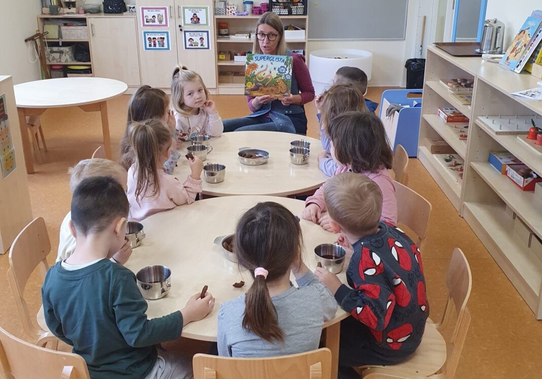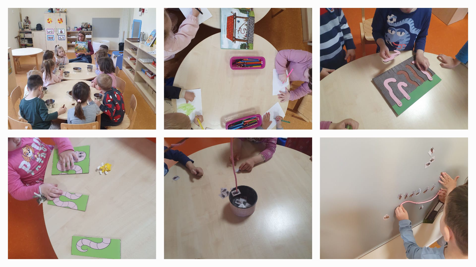 Četvrta čajanka u „Zvjezdicama“ održana je uz slikovnicu „Superglista“. Nakon razgovora o sadržaju slikovnice, djeca su crtala što im se najviše svidjelo. Ponuđene su im slagarice i umetaljke s glistama, a napravili smo im bunar i superglistu na štapiću pa su spašavali bube iz bunara. Na magnetnoj ploči smo pripremili likove iz priče pa su uz njih slagala radnju iz slikovnice u vremenskom redoslijedu. Žive gliste koje su promatrali povećalom u vrtićkom dvorištu izazvale su opće oduševljenje! Djeca su bojila kartonske valjke koje smo zajedno nanizali na špagu i organizirali utrku „čija je glista – superglista“. Najzanimljivija aktivnost je bila traženje glista skrivenih u obojenoj riži i vađenje glista pincetom iz riže, a za kraj je najslađe bilo zasladiti se bombonima u obliku glista nakon svih uzbudljivih aktivnosti.