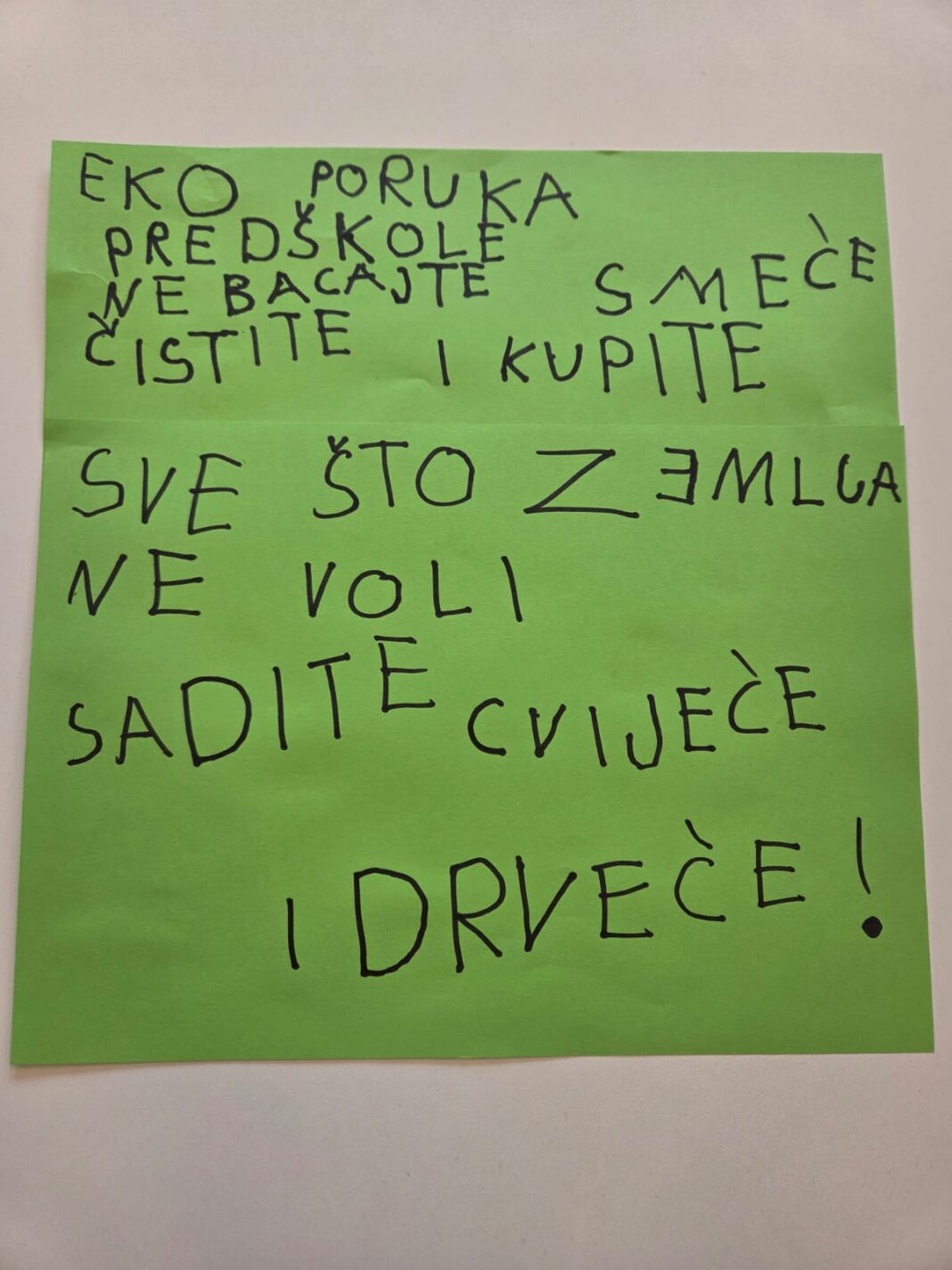 Interakcijskim razgovorima, uz edukativne knjige i slikovnice, djeca su napravila raznolike likovne radove, te osmislili vlastite Eko poruke.